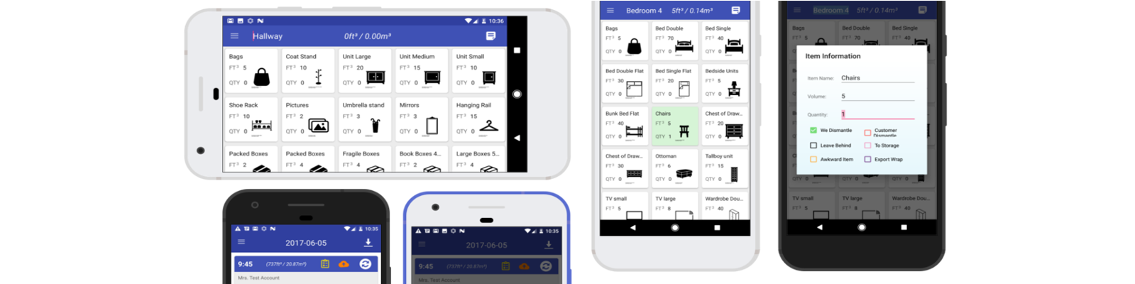 Estimating made easy, quick and simple to use, calculates your volume, itemises dismantling, packing materials, awkward items, access issues, email your results, make notes and so much more... We have it sorted for you - our Android APP will integrate into our main software where you can manage all your data. Please enquire at info@managemymoves.com or by calling 0800-533-5136.